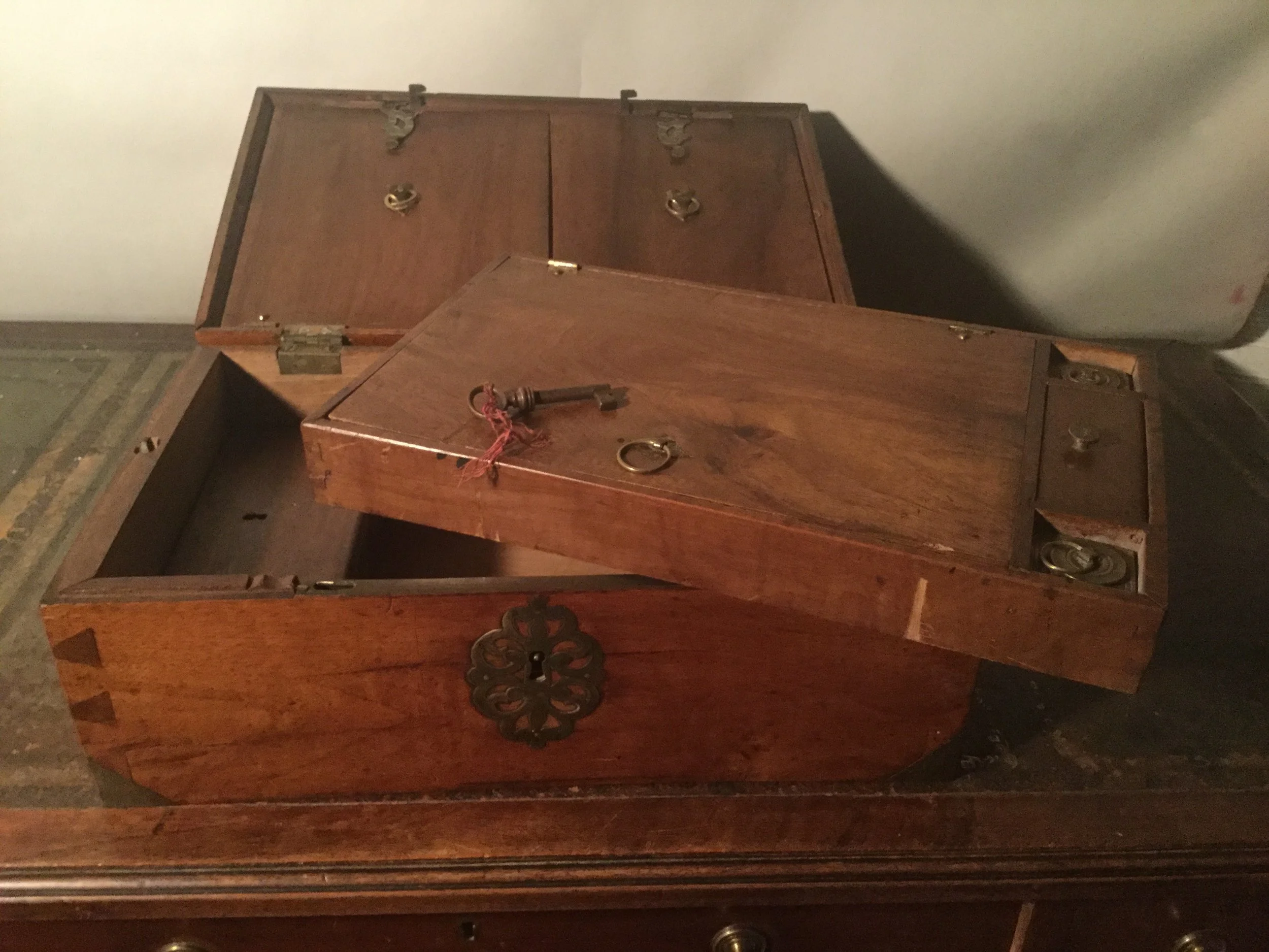 Nice Travel Set or Captain’s Writing Box. Remarkable condition, original keys, hinges, hooks. Walnut or Mahogany or Teak.