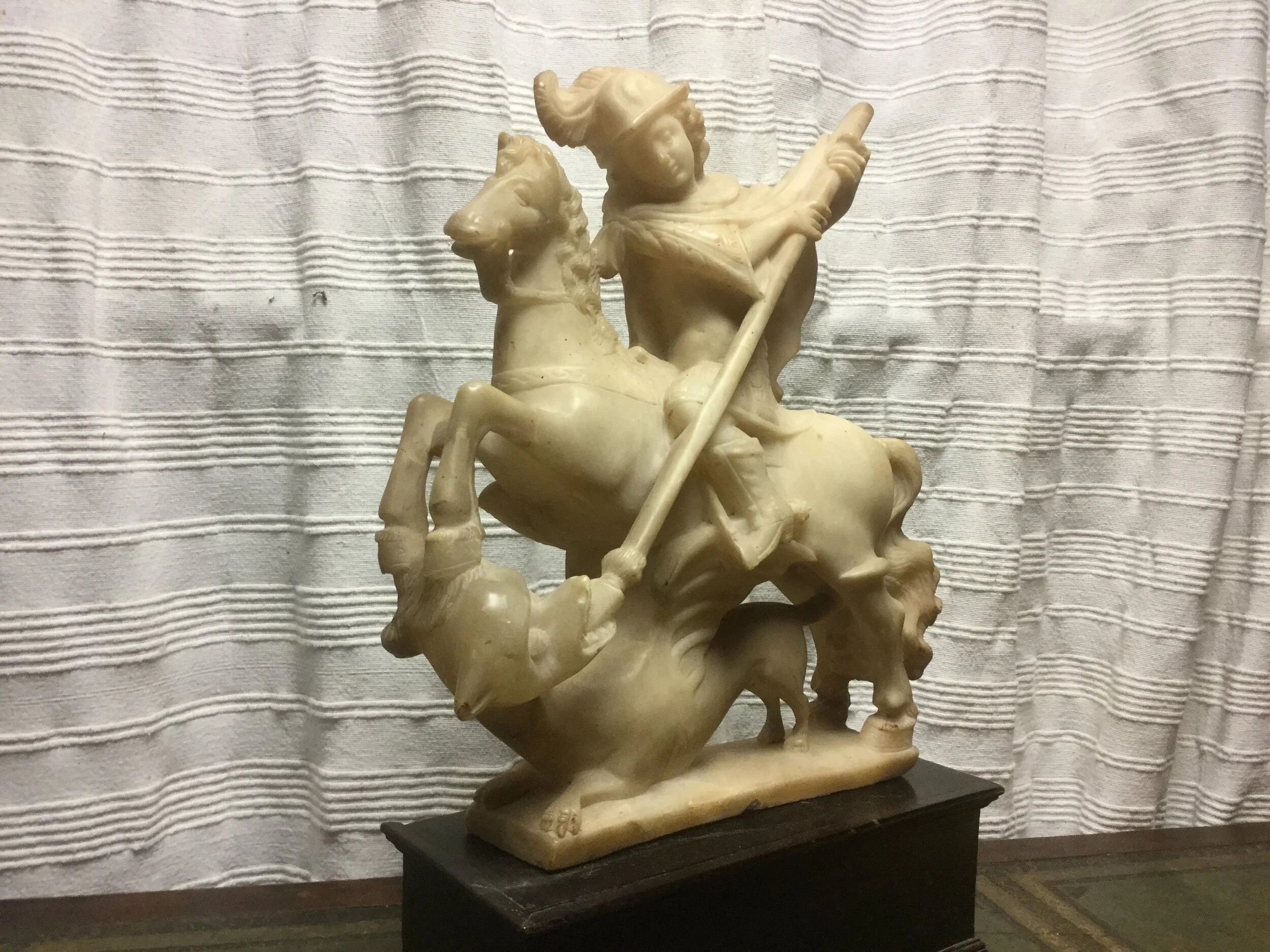 Alabaster sculpture depicting Saint George slaying the Dragon. Beautiful classical composition and well balanced. Good condition, small minor accidents including the feather of the helmet damaged on the back. Italy or Sicily, 18th century.