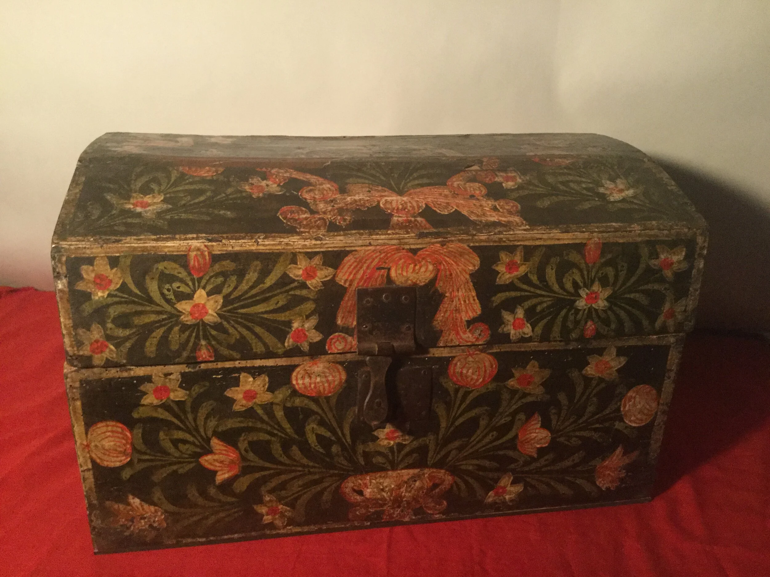 Early 19th century hand painted wedding box from Normandy, France. Colorful exterior with botanical decor, flowers and green leaves. Original paint and lock closure. Exceptional dimensions. Good condition with traces of use.