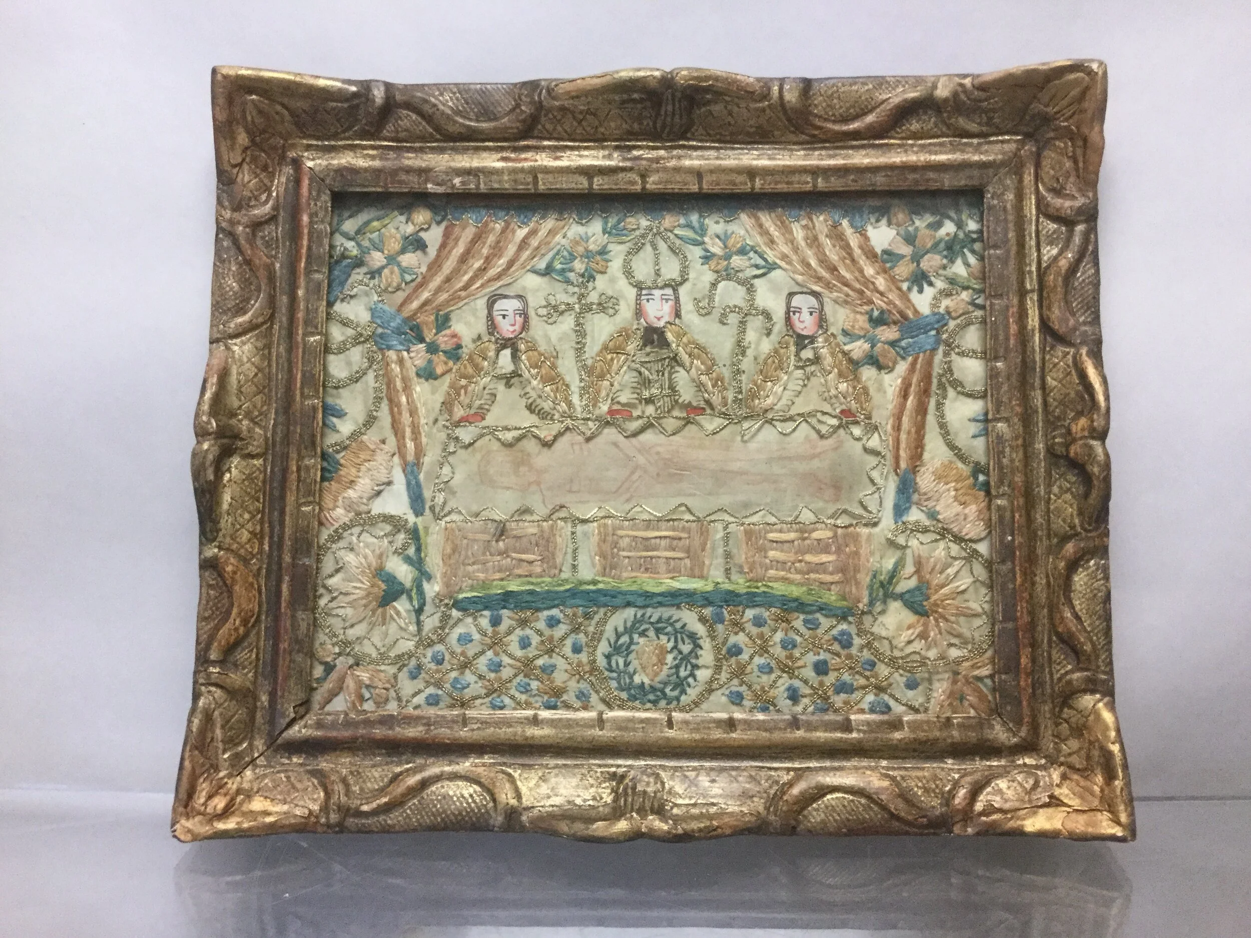18th century embroidery representing the Shroud of Turin in a frame from the same period. The colors are very fresh but there are some lacks in the silk however the whole is very charming.