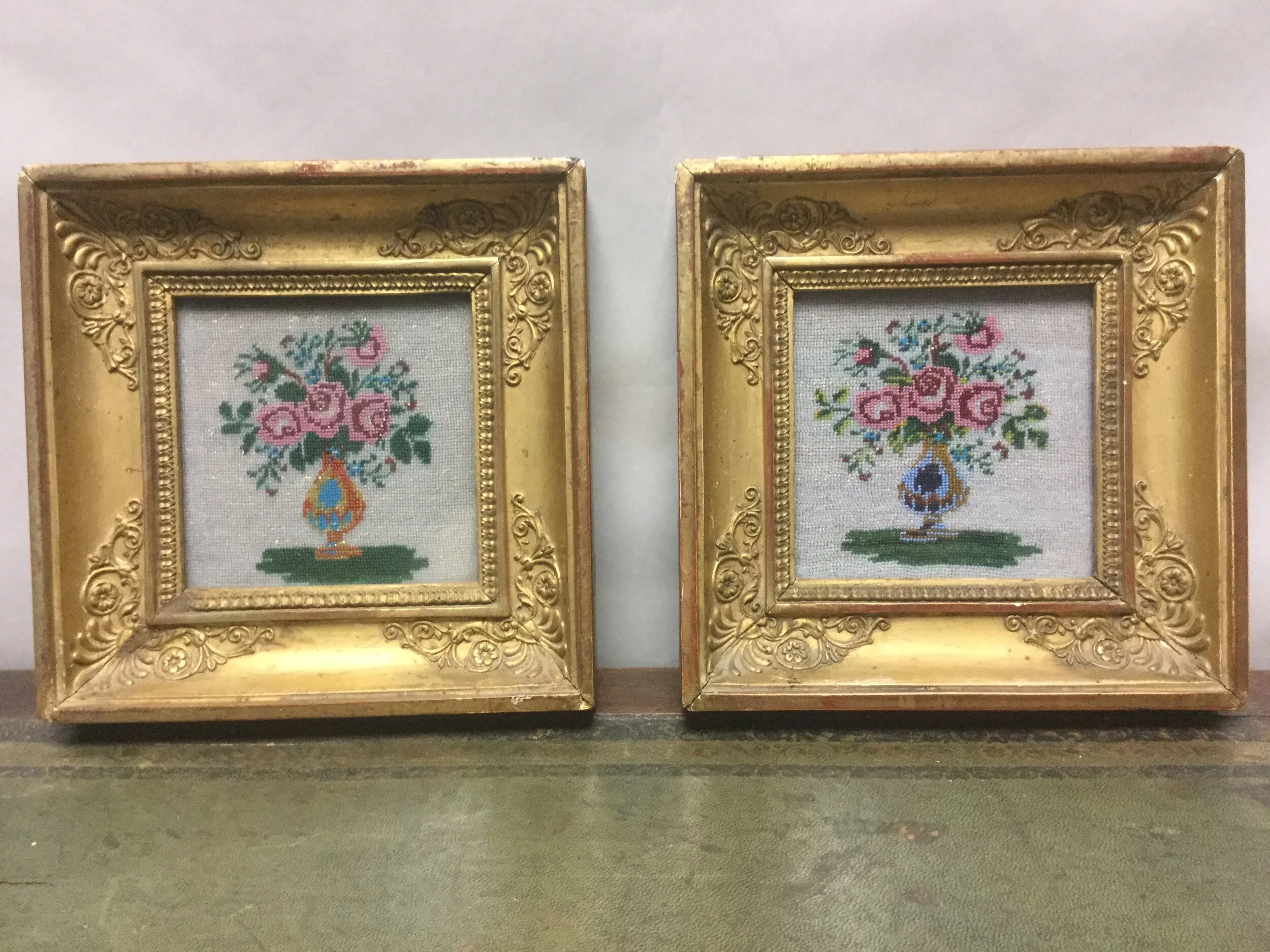 Pairs of beadwork representing a bouquet of flowers in a piedouche vase on a terrace of greenery. The finesse of these bouquets treated in miniature is admirable with a variation in the color of the vases. Original frame gilded with leaf, Empire period.