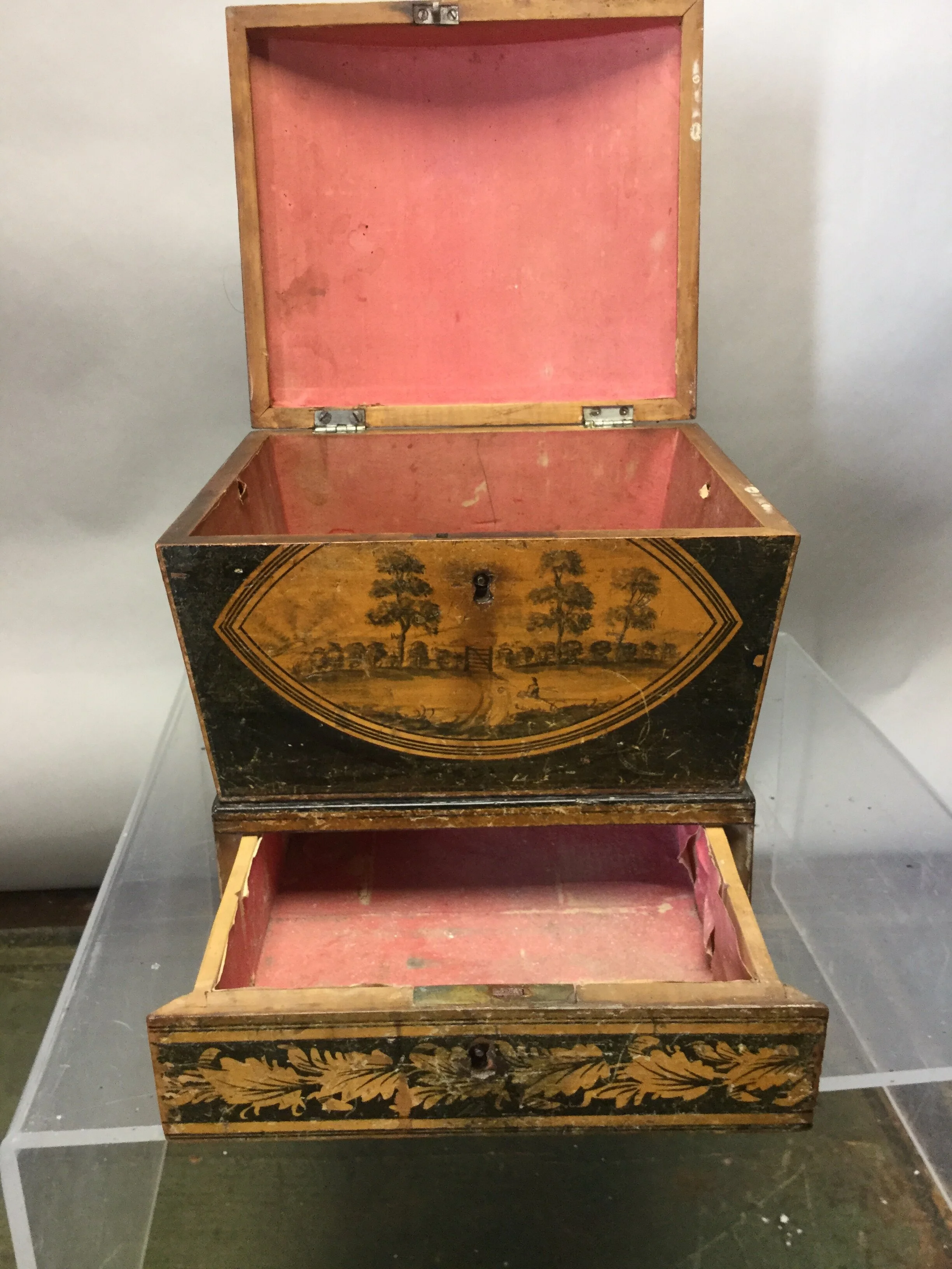 Spa box (not restored) decorated with vignettes on all sides painted in grisaille, representing the sites of the Spa surroundings. A drawer is hidden in the plinth. The original shape of this box and the almond ornamentations make it so charming. Some wear and small gaps. Beginning of the 19th century.